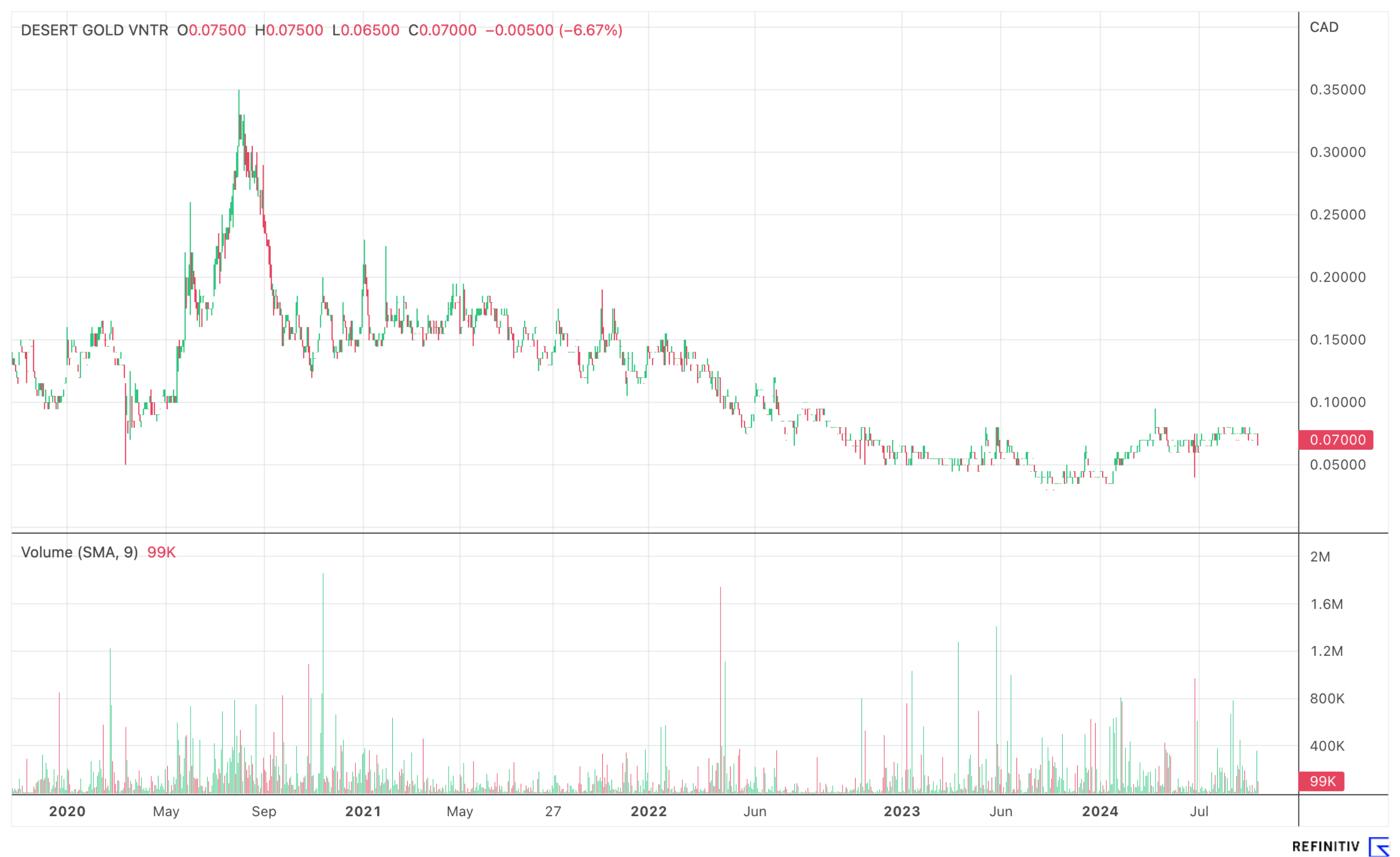 Vor dem Hintergrund, dass die Feinunze Gold momentan bei über 2.600 USD gehandelt wird und der Börsenwert von Desert Gold Ventures mit 1,1 Mio. Unzen Gold im Boden lediglich rund 11 Mio. USD beträgt – heißt also, dass die Börsenbewertung lediglich 10,00 USD pro Feinunze Gold im Boden ist. Vollkommen absurd, was vorrangig sicherlich an der Unbekanntheit dieses Unternehmens liegt und zugleich eine exzellente Einstiegsgelegenheit darstellt! Wenn wir davon ausgehen, dass in Westafrika die Förderkosten rund 1.000 USD pro Feinunze betragen, dann bleiben salopp 1.600 USD pro Feinunze über. Wie gesagt, momentan ist die Bewertung bei 10,00 USD je Feinunze im Boden – der theoretische Gewinn liegt also 160-fach höher. Das ist eine vereinfachte Darstellung des Potenzials, das zeigen soll, wie viel Kurssteigerung möglich ist.