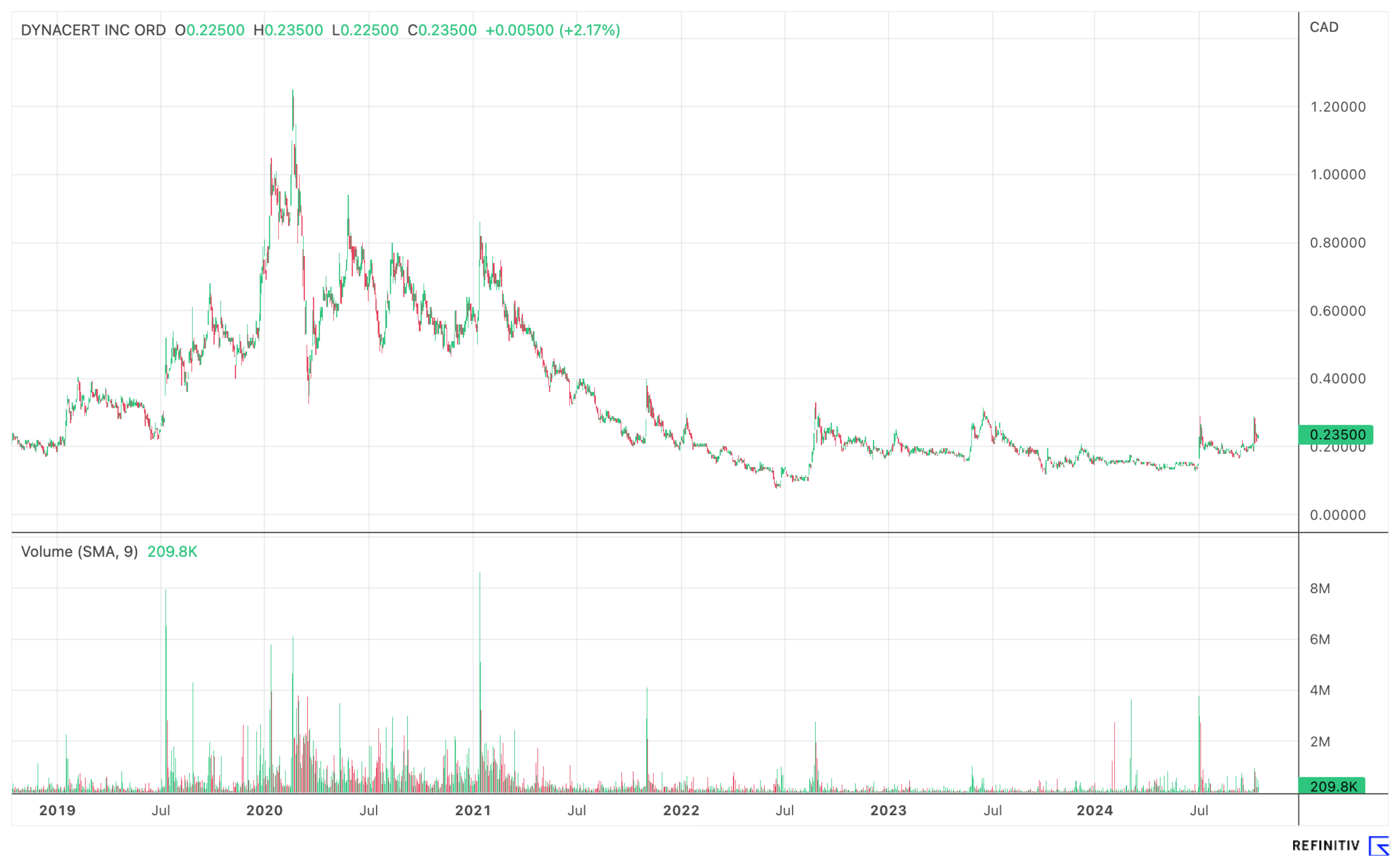 Das kanadische Technologie-Unternehmen dynaCERT Inc. (WKN: A1KBAV | ISIN: CA26780A1084 | Ticker-Symbol: DMJ) hat vollkommen unverschuldet holprige vier Jahre hinter sich. Grund dafür waren die staatlichen Lockdown-Maßnahmen seit dem Ausbruch der Corona-Pandemie in 2020. Bis dahin lief alles nach Plan. Der Aktienkurs stieg auf 1,25 CAD und im selben Jahr wurde von GBC Investment Research ein Kursziel von 2,20 CAD in Aussicht gestellt. Der Aktienkurs stürzte in Folge der angeordneten Einschränkungen des Geschäftsbetriebes dramatisch auf einen Tiefstand von nur noch 0,075 CAD ab.