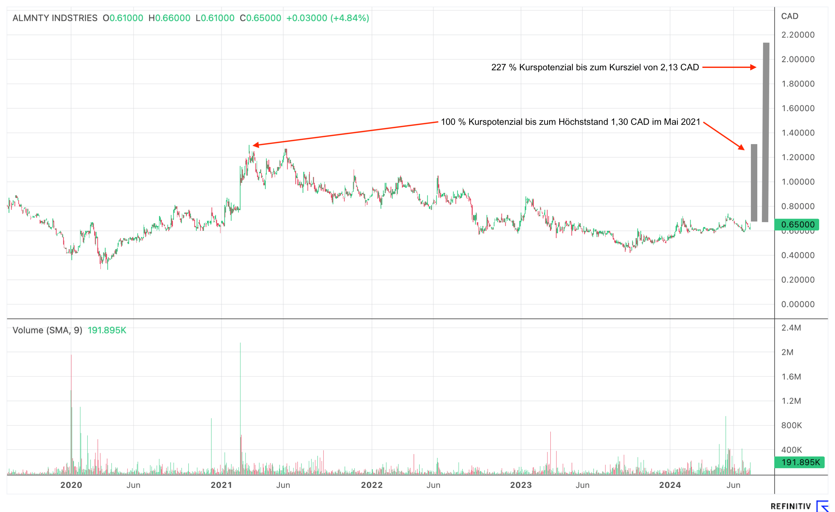 Die Aktie von Almonty (WKN: A1JSSD | ISIN: CA0203981034 | Ticker-Symbol: ALI) schloss am Freitag an der Heimatbörse TSX in Toronto bei 0,65 CAD, was einem Börsenwert von 168 Mio. CAD (113 Mio. EUR) entspricht. Angesichts der strategischen Bedeutung des Unternehmens ist dies eine äußerst günstige Bewertung, denn die Fertigstellung der Mine in Südkorea kostet bereits rund 125 Mio. USD (115 Mio. EUR). Kaum verwunderlich, dass der Analyst Peter Thilo Hasler, CEFA, von Sphene Capital ein Kursziel der Aktien von 2,13 CAD und somit ein Kurspotenzial von 227 % sieht.
