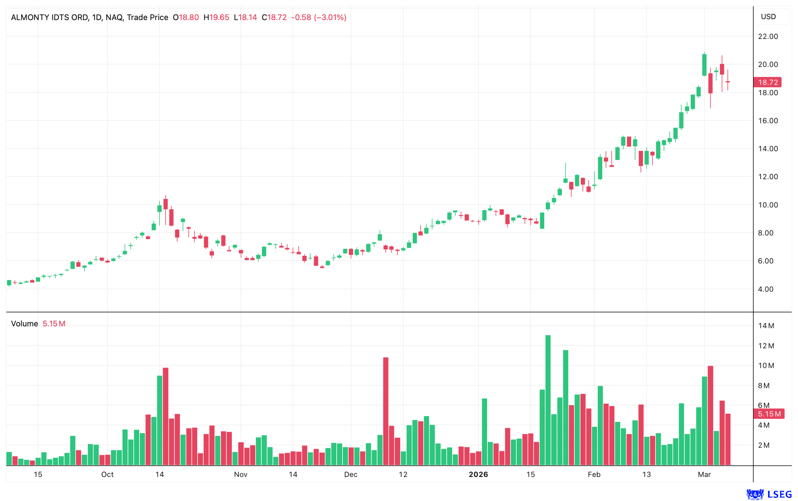 In den vergangenen Tagen haben verschiedene Analysten ihre Kursziele für die Almonty Aktien nach oben angepasst: D.A. Davidson erhöht das Kursziel von zuvor 18,00 USD auf 25,00 USD und bestätigt das BUY-Rating. Cantor Fitzgerald erhöht von 14,50 USD auf 25,80 USD und bleibt ebenfalls beim BUY-Rating. Am Freitag gingen die Aktien zu 18,72 USD ins Wochenende.