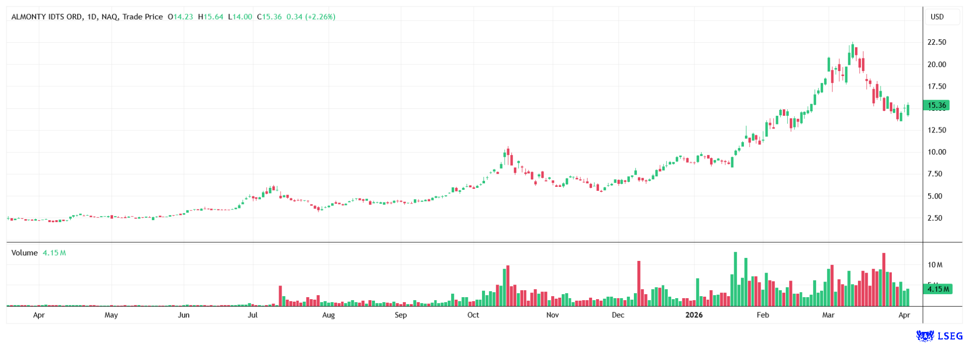 Die Aktie von Almonty Industries ist eine der erfolgreichsten Börsenstories der jüngeren Vergangenheit. Vom kleinen, relativ unbekannten Wolfram-Produzenten ist Almonty innerhalb weniger Monate zum vielbeachteten Rohstoffkonzern mit Milliardenbewertung herangewachsen. Der Aktienkurs hatte sich von Anfang 2025 bis Mitte März 2026 annähernd verzwanzigfacht. In der Spitze – bei Kursen von über 22 USD (umgerechnet rund 30 CAD oder gut 20 EUR) – lag der Börsenwert bei über fünf Mrd. USD. Doch seit gut zwei Wochen schwächelt der Kurs und ist seither um fast 30 % eingebrochen. Einen echten fundamentalen Grund für den Rücksetzer gibt es eigentlich nicht. Interessierten Neueinsteigern bietet sich dadurch jetzt eine attraktive Kaufchance. Denn die Wachstumsstory von Almonty ist nach wie vor voll intakt.