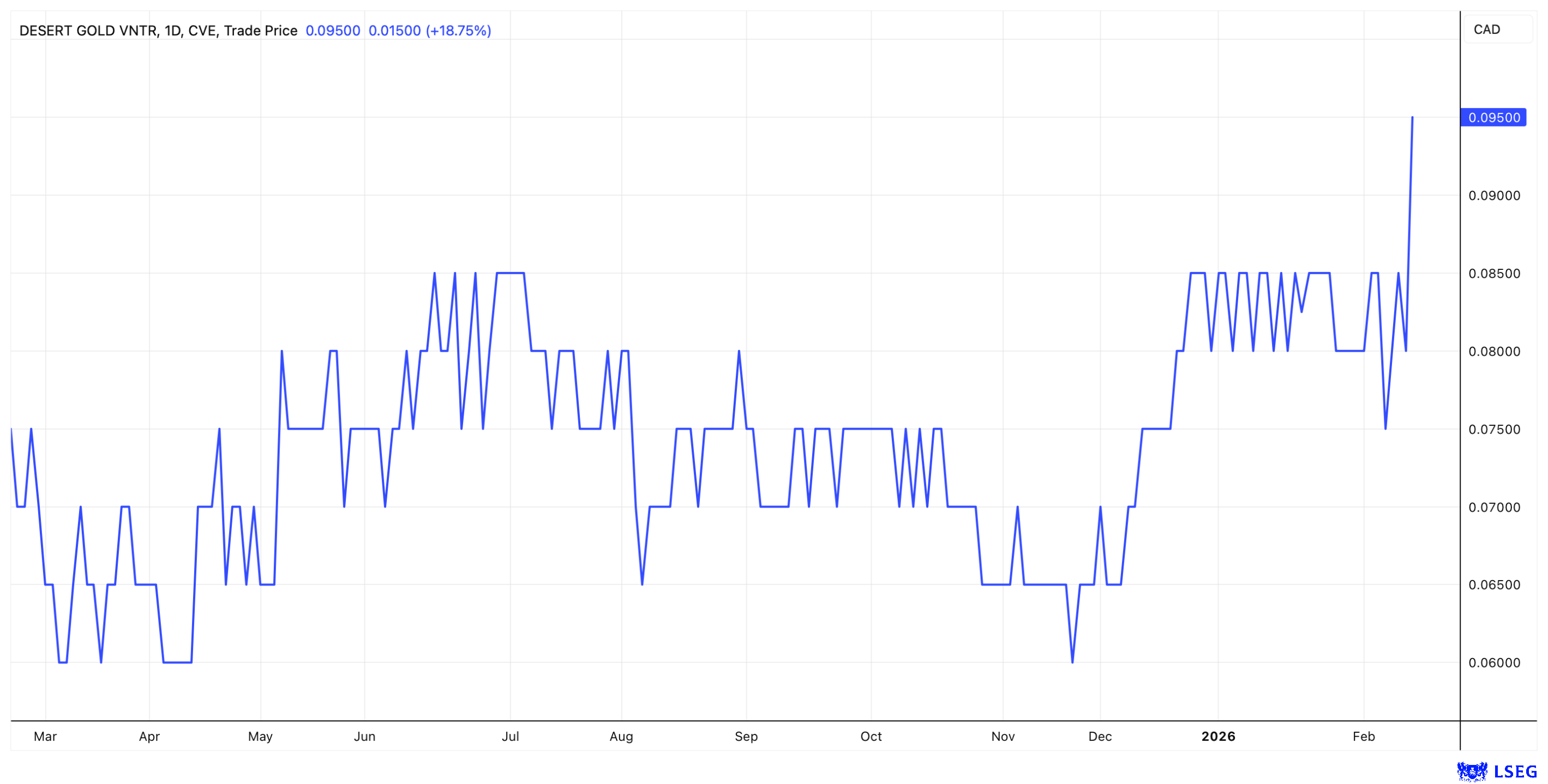Analysten beschreiben die Lage ohne Umschweife: Die Marktkapitalisierung von Desert Gold bei nur 25,7 Mio. CAD, liegt weit unter dem berechneten Nettoinventarwert – und zwar nicht nur ein bisschen. Es ist eine Diskrepanz, die man nicht übersehen kann. GBC-Research schrieb in seinem letzten Bericht, dass bei einem Spot-Goldpreis von 4.070 USD je Unze das Projekt einen Nachsteuer Kapitalwert (NPV) von 124 Mio. USD hat. Jetzt, wo der Goldpreis weiter auf 5.050 USD gestiegen ist, weitet sich diese Unterbewertung sogar noch aus. Die GBC-Analysten sehen bei ihrer Kaufempfehlung ein Kursziel bis zum Jahresende von 0,50 EUR. Gestern stieg der Aktienkurs auf 0,055 EUR.