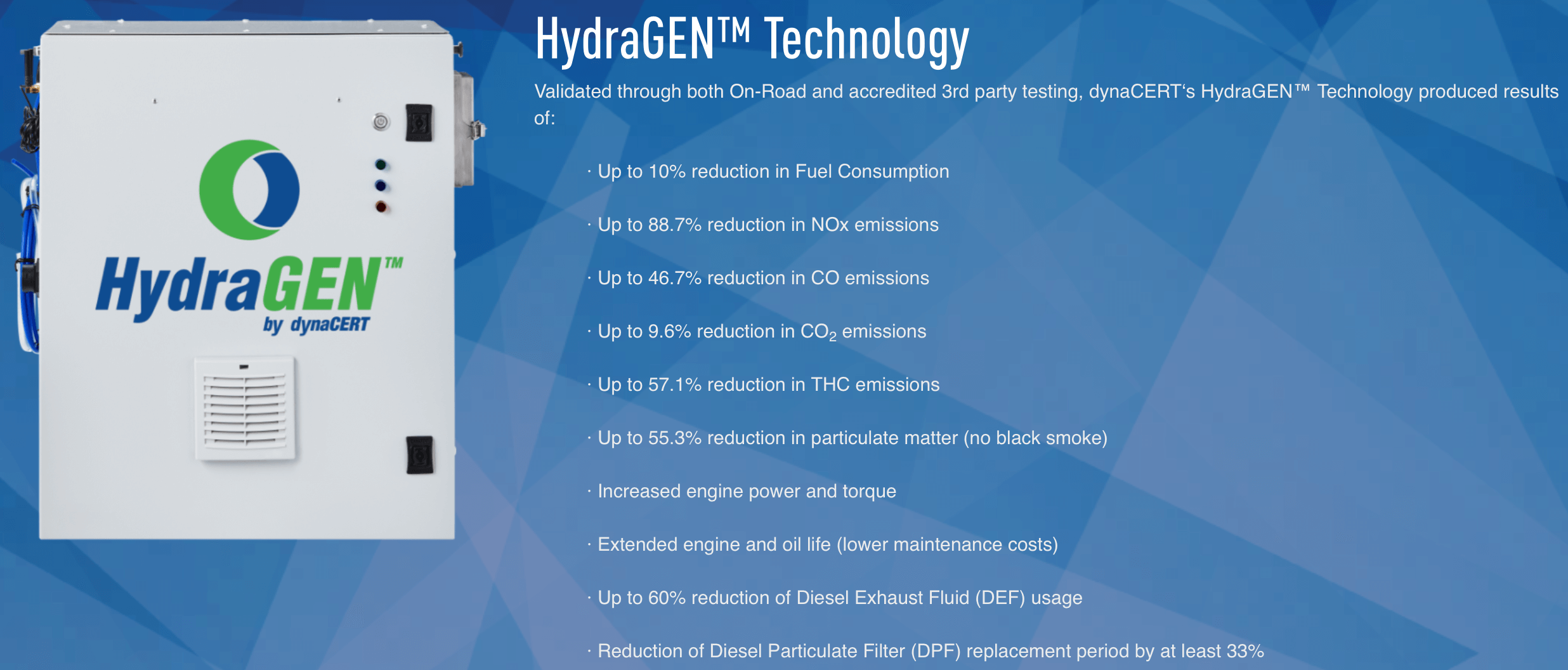 Das Technologieunternehmen dynaCERT gehörte im Zusammenhang mit den Corona Maßnahmen in der kanadischen Provinz Ontario seit März 2020 zu den Leidtragenden der Pandemie. Das Unternehmen hat Geräte zur Nachrüstung von Dieselmotoren entwickelt, die den Wirkungsgrad bei der Verbrennung steigern. Der Wasserstoff wird auf Bedarf an Bord erzeugt und über die Luftzufuhr der Verbrennung hinzugefügt. Laut Webseite kann der Verbrauch von Dieselkraftstoff gesenkt und somit auch der Ausstoß von Schadstoffen reduziert werden.