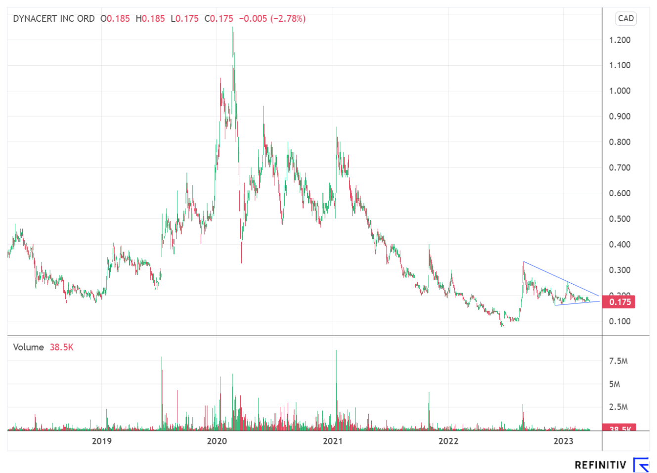 An der Schwelle des unmittelbaren Durchbruchs scheint das kanadische Technologie-Unternehmen dynaCERT zu stehen. Der Wasserstoff-Pionier bietet bereits jetzt und heute eine Technologie zur Nachrüstung von Dieselmotoren an. Vorteil ist, dass der Wirkungsgrad von Dieselmotoren durch Zuführung von Wasserstoff steigt. Dadurch sinkt der Verbrauch und die Abgabe von Schadstoffen. Zukünftig soll die CO2-Einsparung in Carbon Credits, also CO2-Zertifikate, verbrieft werden. Die Corona-Lock-Down-Phasen hat den Produktlaunch massiv verzögert, aber seit Herbst 2022 fängt der Vertrieb an zu rollen.