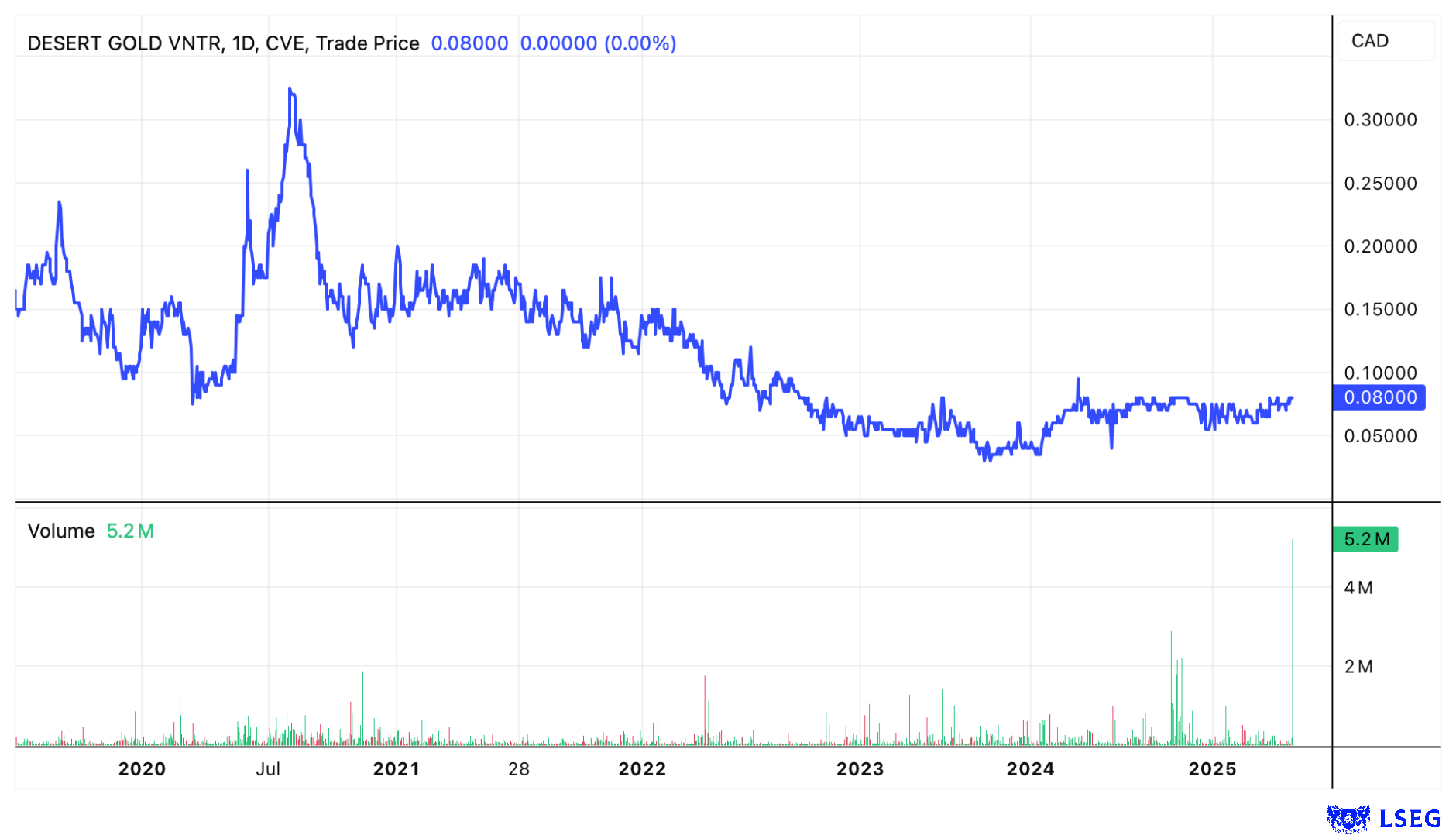 Desert Gold Ventures Inc., Aktienkurs seit 16. Juni 2019 in CAD, Stand: 15.06.2025, Quelle: LSEG -