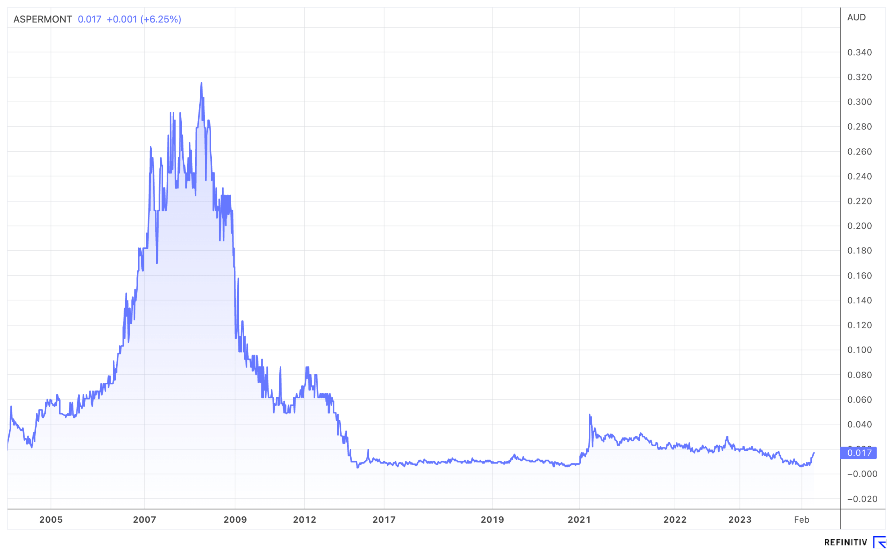 Die Aktien von Aspermont werden in Australien an der ASX und an zahlreichen deutschen Börsen gehandelt. Wie bei den meisten australischen Unternehmen ist die Anzahl der Aktien im Vergleich zu deutschen Gesellschaften extrem hoch. Insgesamt kann das Unternehmen 2,42 Mrd. Aktien vorweisen, die am Freitag zum Kurs von 0,017 AUD ins Wochenende gegangen sind. Die Analysten von GBC Research haben kürzlich eine Kaufempfehlung mit Kursziel 0,07 AUD veröffentlicht. Wenn der Markt erst richtig anfängt zu laufen, dann steckt in dem Geschäftsmodell mit einer Bruttomarge von über 57 % eine Menge Potenzial. Am 28. Dezember 2007 ging die Aktie sogar beim Stand von 0,315 AUD aus dem Handel. Das ist lange her, aber 38 Monate zuvor, also im Oktober 2004, notierte Aspermont noch bei 0,021 AUD.