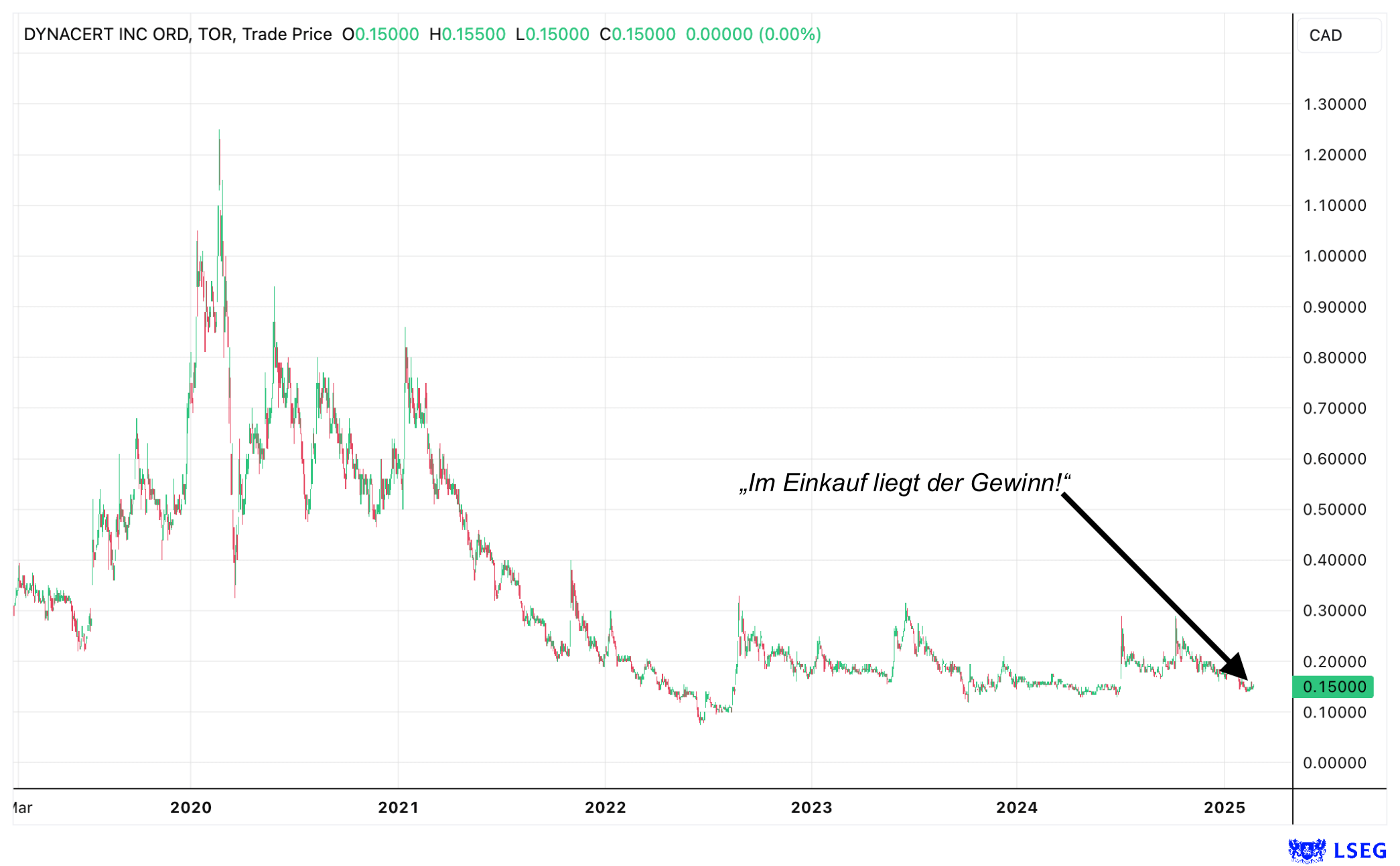 Bereits 2020 stand dynaCERT kurz vor einem bedeutenden Erfolg. Die bahnbrechende HydraGEN-Technologie zur Emissionsreduzierung von Verbrennungsmotoren erregte großes Investoreninteresse. Der kanadische Investor Eric Sprott beteiligte sich mit 14 Mio. CAD zu 0,50 CAD pro Aktie und der Kurs stieg auf bis zu 1,25 CAD. Doch dann folgte der unerwartete Rückschlag: Staatliche Corona-Maßnahmen stoppten das Geschäft abrupt. Nun, fünf Jahre später, scheint der Innovationsprozess endlich Früchte zu tragen – mit möglicherweise bahnbrechenden Folgen. Wiederkehrende Umsätze mit Erstkunden stellen die Weichen für die Serienfertigung. Mit Blick auf das Kursniveau von Anfang 2020 wird deutlich, wie viel Potenzial in der Aktie steckt.