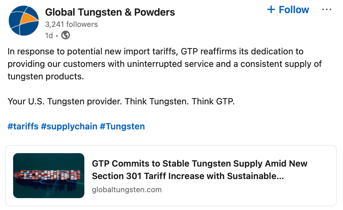 Die Liste der möglichen Käufer ist lang – und hochkarätig. Neben den direkten Abnehmern von Almonty könnten auch neue Marktteilnehmer und sogar Regierungen Interesse zeigen. Denn eines ist klar: Ohne Wolfram geht nichts – keine Chips, keine High-Tech-Produkte, keine moderne Rüstungsindustrie. Während es bei anderen Rohstoffen eine Vielzahl von Unternehmen gibt, ist Almonty mit den Wolframvorkommen und Produktionskapazitäten in der Lage, den gesamten Bedarf der USA innerhalb eines Jahres zu decken - eine Monopolstellung ist offensichtlich. Hat ein LinkedIn Post eine mögliche Übernahme angekündigt? Die Global Tungsten & Powders Corp. (GTP) hält bereits 13,97 %, also 38,15 Mio. Aktien, von Almonty und hat in den vergangenen Tag auf dem Business Netzwerk die folgende übersetzte Nachricht veröffentlich: "Als Reaktion auf mögliche neue Importzölle bekräftigt GTP sein Engagement, unseren Kunden einen ununterbrochenen Service und eine kontinuierliche Versorgung mit Wolframprodukten zu bieten. Ihr Wolframanbieter in den USA. Denken Sie an Wolfram. Denken Sie an GTP."