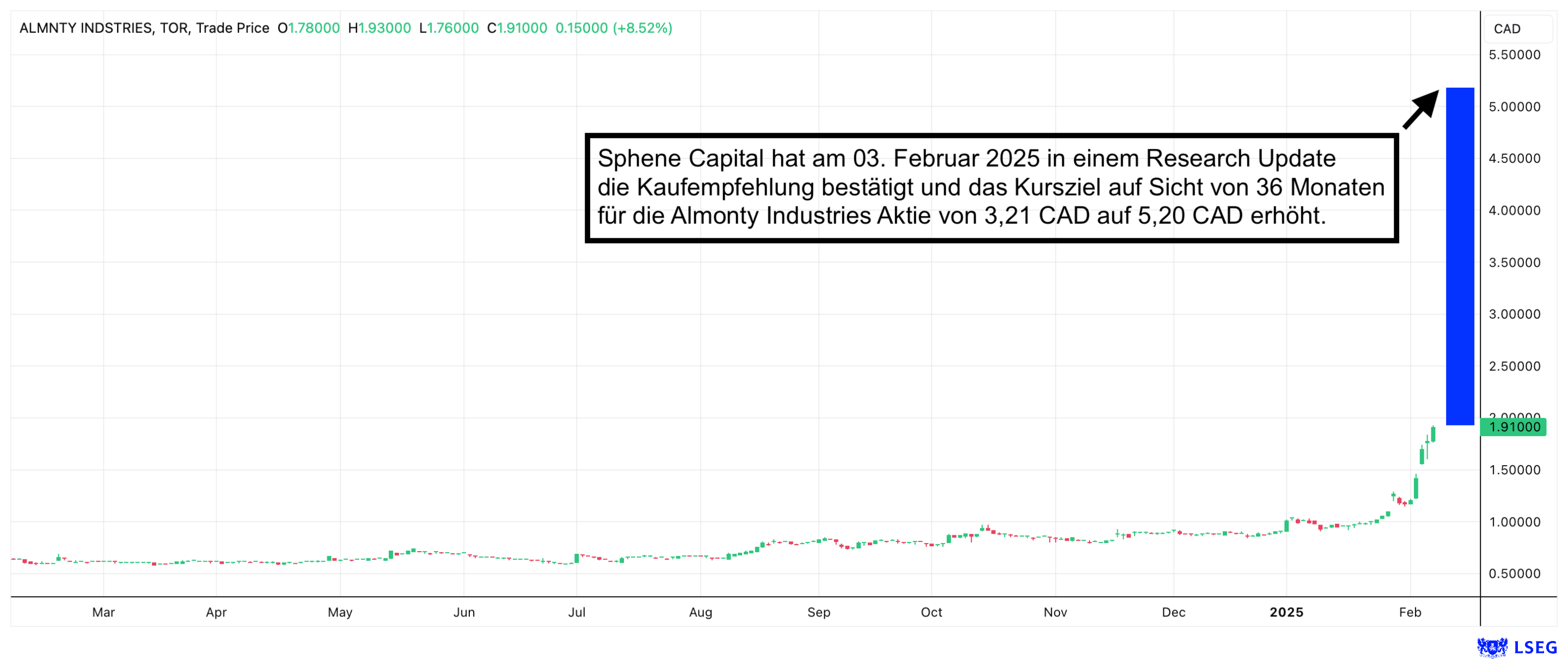 Sphene Capital-Analyst Peter Thilo Hasler reagierte prompt: Er erhöhte sein Kursziel für Almonty von 3,21 CAD auf 5,20 CAD (Quelle). Und das war noch vor den chinesischen Sanktionen für Wolfram! Die fundamentale Neubewertung des Unternehmens scheint unausweichlich.