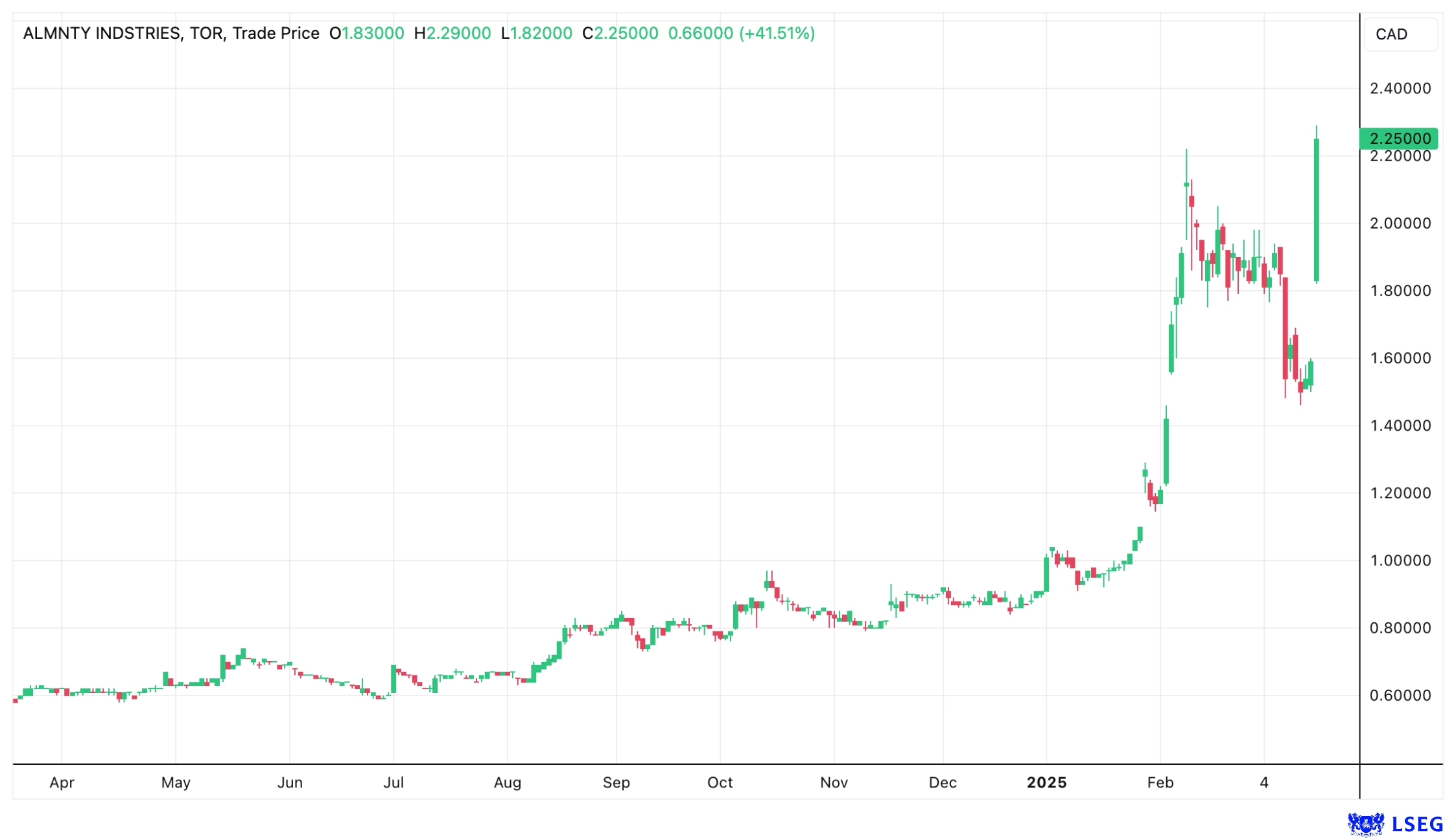 MP Materials, ein US-Konzern mit Fokus auf Seltene Erden, hat aktuell eine Marktkapitalisierung von 4,3 Mrd. USD – trotz eines Nettoverlustes von 65,4 Mio. USD bei Umsätzen von 203,9 Mio. USD im Jahr 2024. Analyst Peter Thilo Hasler von Sphene Capital prognostiziert für Almonty Industries (Börsenwert rund 400 Mio. USD) im Jahr 2026 Umsätze von 192,5 Mio. CAD und ein EBIT von 69,4 Mio. CAD. Seine Kaufempfehlung hat er im Februar auf ein Kursziel von 5,20 CAD angehoben. Würde man jedoch die vergleichbaren Bewertungsmaßstäbe von MP Materials bei Almonty ansetzen, dann wäre das eine massive Neubewertung des Unternehmens im Milliardenbereich!